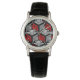 Titta på ett klassiskt japanskt kimonomuster med stiliserade tranor, arrangerade i ett mönster av hexagoner, i djuprött, ljust och mellangrått, på svart bakgrund