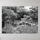Svart och vitt foto av en trädgårdsdamm med en träbro och ett vatten-hjul. Den här söten är bara en del av en vacker tempelträdgård i Kanagawa, Japan.