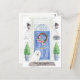 Meddela din ny adress med vår snyggt med ett japanskt spitz, blått ytterdörr, välkomstmat, skiffertecken, toparies och en blommigt krans som sätts på en grått tegelbakgrund.