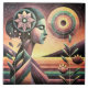 Färggrafik i abstrakt av en kvinna som färglagts i blommor, sol och stjärnor, med vattenfärgseffekt och struktur.