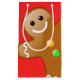 Pepparkaksgubbe med grön och orange gelébryta på röd bakgrund.