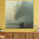 En enorm vit drake huggen ur felfri sten tornar över en i dimma höljd stads vattengräns, med enormt huvud och taggiga horn som fyller himlen medan bleka lysande ögon blickar ned. Ett litet barn och en lång, mantlad vuxen står små på en väderbiten pir och ser upp i tyst vördnad medan tjock dimma virvlar och en låg solnedgång kastar svag orange ljus runt den mytiska siluetten. Avlägsna kupolformade byggnader och spiror tonar bort i diset och förstärker skala, undran, legend möter verklighet och den sublima kontrasten mellan mänsklig bräcklighet och urgammal makt. Perfekt för fantasysovrum, meditationsutrymmen, hemmakontor, spelrum, gotisk-modern dekoration eller som inspirerande gå