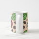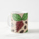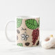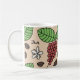 En kaffeanläggning med löv, blommor, bär och kaffebönor på en snyggt mönster.