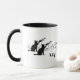 Två katter i silhuette arbetar med att spela trumpeter för en vidgande massa möss med musik noter som flyger runt på ett tvåtonat kaffe mugg.