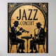 Denna stiliserade målning är en grafisk skildring av en jazzkonsert. Två musiker, återgivna i svarta silhuetter, sitter och framträder, en spelar en trumpet och den andra en saxofon. Bakgrunden är en stor, texturerad guldkrets med orden "JAZZKONSERT" i feta svarta bokstäver. Konsten har en minimalistisk men elegant estetik, som kombinerar den klassiska känslan av en jazzföreställning med en modern, dekorativ stil.