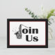 Ge din nästa händelse en jazzig touch med denna Jazzsaxofon Gå med oss party-inbjudan. Inbjudan har en svart-vit design med en touch av rött i kanten och orden GÅ MED OSS där J är en saxofon. Musikaliska noter kompletterar den rena, samtida designen. Anpassa med din festinformation. Klicka på anpassa för att ändra typsnitt och textplacering.