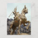 Bild av en brons staty av Joan of Arc som sitter på en häst och som är belägen i Paris, Frankrike - statyn visas nedan, som reflekterar ljus som belyser statyn i tidigt morgon.