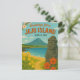 Scenisk syn på ön Jeju, Sydkorea med staty, blommor, kusten och berg