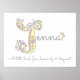 Vacker initial / monogram konst anpassad namnskylt perfekt för en flickas sovrum eller lekrum i nyanser av grått, vitt, gult, rosa och lila. Personifiera med ditt barns eget namn som börjar med J, och namnbetyder för en verkligt personlig touch i ditt barns sovrum eller barnkammare, detta exempel är för namnet Jenna En liten fågel, rättvis, himmelsk & vältalig. Söt posterskrivning idealisk som gåva till en ny bebis, dop eller baby shower. © Unik J monogram hjärtan och blommor ritning beskrivning och grafisk konst design av Sarah Trett. www.sarahtrett.com för www.mylittleeden.com