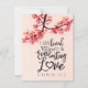 Inspirationscitat bibelvers kort med platt design visar ett naturfoto av en gren med rosa blommor på rosa bakgrund. Det visar en del av ett uppmuntrande bibelcitat, Jeremia 31:3, "Jag har älskat dig med en evig kärlek." Hälsningen kan anpassas eller raderas för en handskriven hälsning och kortet kan användas vid många tillfällen. Foto av Patrick Shaun.