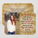 Bibelsvers från "Ty jag vet vilka planer jag har för er", säger Herren, "planer som syftar till er välfärd och inte till fördärv, planer som ger er hopp och en framtid." Jeremia 29:11. Bakgrund i vintage rustic pergamentpapperstil med utsmyckad text, med ditt foto och mörkröd och svart handskriven borstpennafont, Inspirerande och konstnärligt modern kristen religiös, kyrka privatskola eller hemundervisad examenshögtid med vis råd för gymnasie- eller högskolestudent. Inkluderar detaljer om din mottagning eller fest på baksidan.