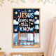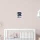 En akvarellillustration av en barnkammarscen med stjärnor, moln och frasen "Jesus Loves Me This I Know" i lekfulla, mjuka färger. Bakgrunden visar en natthimmel med stjärnor och fluffiga vita moln. Det finns en trävagga med en vit filt och en liten leksak i den. En mjuk blå lampa står placerad bredvid vaggan. Golvet är gjort av träplankor. Väggarna är målade i ljust blått. Frasen "Jesus Loves Me This I Know" är skriven med mjuka rosa och blå bokstäver ovanför vaggan.
