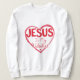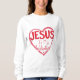 Den här söta och snyggt t-shirt-skjortan har en röd bild som säger "Jesus" i stort brev med frasen "Han är min kärlek" under ett roligt rött dekorativt typsnitt. Visa hur mycket du kärlek Jesus på ett roligt och trendig sätt.