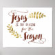 Fin Kalligraphy Typography art med ord i svart: "Jesus är orsaken till säsongen." Utformningen omges av lagrar för blommigt av elegant i guldfolie stil.