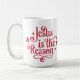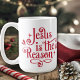 Fira Kristus födelse i julas med det här festliga kaffet mugg som innehåller ordspråket "Jesus är Reason" i ett festive rött dekorativt skript.