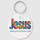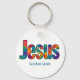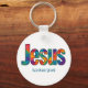 Keychain with Beautiful colorful geometric design of the name of "Jesus" loves you (personalize message or scripture or name). Great gift for Christians who love the Lord and are proud to be His. This keychain is fun to give out for religious celebrations, events and parties such as baptisms and summer BBQ's.