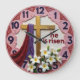 Celebrate the victory of the resurrection with this high-energy and inspiring wall clock. The central face features a high-definition graphic of a golden cross draped with a vibrant purple and red shroud, accompanied by blooming white lilies and the powerful "He Is Risen" proclamation. While the artwork beautifully captures the textured look of a palette-knife oil painting and the outer rim mimics the appearance of hand-sculpted pink timber, this is a lightweight and durable graphic timepiece rather than actual wood or layered plaster. The bold navy-blue numeric markers are set against a decorative pink border, ensuring the time is easy to read against the clean, textured-style background. This polished timepiece serves as a perfect focal point for a kitchen, living room, or seasonal display. It is a professional and meaningful self-gift for those wishing to celebrate the spiritual joy of the Easter season.