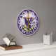 Celebrate the joy of the resurrection with this high-energy and beautifully artistic wall clock. The central face features a high-definition graphic of a wooden-style cross draped in a vibrant purple shroud, surrounded by fresh white lilies and the "he is risen" message. While the design masterfully mimics the appearance of a multi-layered, scalloped purple frame and a textured dial, this is a lightweight and durable graphic timepiece rather than actual wood or sculpted plaster. The bold purple numeric markers are set within circular white medallions, providing a professional and polished contrast that makes the time easy to read at a glance. This timepiece serves as an inspiring focal point for any kitchen, living area, or seasonal display, making it a meaningful self-gift for those who appreciate high-quality spiritual art.