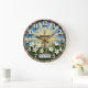 Celebrate the joy of the resurrection with this high-energy and vibrant spiritual wall clock. The central face features a high-definition graphic of a silver-style cross set against a radiant yellow sunburst and a serene blue sky. Blooming white lilies, lush green grass, and a symbolic white dove complete the scene above the "he is risen" proclamation. While the artwork masterfully mimics the textured look of a palette-knife oil painting and the outer rim appears to be crafted from multi-toned rustic river stones, this is a lightweight and durable graphic timepiece rather than actual stone or layered plaster. The bold white numeric markers provide exceptional contrast against the colorful background, ensuring the time is easy to read at a glance. This professional timepiece serves as an inspiring focal point for any living space, making it a meaningful self-gift for those celebrating the Easter season.