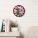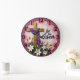 Celebrate the miracle of the resurrection with this high-energy and beautifully artistic wall clock. The central face features a high-definition graphic of a golden cross draped in a flowing purple shroud, surrounded by elegant white lilies and the script message "He Is Risen." While the artwork masterfully mimics the textured, heavy-stroke appearance of an impasto oil painting and the ornate border looks like hand-carved, purple-stained timber, this is a lightweight and durable graphic timepiece rather than actual wood or layered plaster. The deep navy-blue numeric markers provide exceptional contrast against the soft pink and cream textured background, ensuring the time is easy to read. This polished timepiece serves as an inspiring focal point for any room, offering a professional and meaningful self-gift for those wishing to showcase their faith with vibrant, high-quality spiritual art.