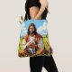 Christian religious tote bag with an ai illustration of Jesus Christ holding a lamb and smiling.