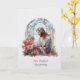 Det här eleganta personliga kondoleanskortet har en lugn glasmålning av vår herre Jesus som beundrar en ömtålig bukett vilda blommor. Konsten är gjord i mjuka pastelljus av blått, vitt och rosa och inger fred, hopp och mild minnesstund under tider av sorg.