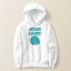 De här flickorna har en blå hand med en pekande finger plus röd skugga som visar ord "Jesus Kärlek" i ett fet utskrift med motsvarande skuggkontur i det religiöst baserade offertemat. Det här hoodiet är tillverkat av en 10 oz bomullspoly-blandning med 100 % instickssleever av bomull ansikte och pansarhål av dubbla-nål och grund-band för extra med mindre matchande bild utskriven på baksidan.
