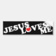 Jesus Kärlek mig stötdekal för kristna. Svart bakgrund, med vit text för fet effekt. Rött hjärta i "o" kärlek.