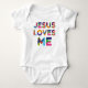 Färgfull dekorativ text Jesus Kärlek mig mot den vita bakgrunden. En vacker bodykostym i baby för pojkar och flickor. Köp en, njut och var lycklig!