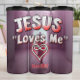 I den här bilden av andlig finns "JESUS" i fetstil, vitt och rött glöd, med "Kärlek Me" i vitt skript. Nedan överlagras ett glansigt rött hjärta med en oändlig symbol ett silhuetterat figur som tittar mot ett ljusstrålande kor i en dörr. Bakgrunden lila-rosa förbättrar detta mönster, som förmedlar kärlek och vägledning för evigt gudomligt .