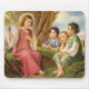 Gammal illustration religiös design med Jesus Kristus som undervisar barn. De befinner sig på en äng under ett skuggande träd med lamm i fjärran.