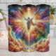 Den här dramatiska bilden visar ett figur med utsträckt arm som går mot ett lysande, glödande kor. Scenen är fylld med en kaleidoskopisk matris av regnbåge och färgstarka strålar. Figur flyter över ett väg av gyllene trappor och flytande moln och skapar en kraftfull och välinspirerande religiösa vision.