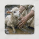 Ett känsligt lamm i en lera-puddle medan det försiktigt räddas av en shepherd's händer. Text och bakgrund färg kan ändras.