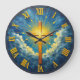 Elevate your home with a high-energy declaration of faith through this stunning artistic wall clock. The central face features a high-definition graphic of a wooden-style cross centered within a brilliant, multi-pointed golden sunburst that pierces through a sea of textured, deep blue and white clouds. While the artwork masterfully mimics the thick, palette-knife texture of an impasto oil painting and the ornate Roman numerals look like raised metallic gold, this is a lightweight and durable graphic timepiece rather than actual timber, canvas, or cast metal. The large, gold-style Roman numerals provide a professional and polished contrast against the atmospheric backdrop, ensuring the time is easy to read at a glance. This timepiece serves as a sophisticated focal point for a living room, office, or prayer space, offering a meaningful self-gift for those who appreciate vibrant, high-quality spiritual art.