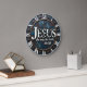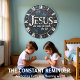 Make a bold and high-energy statement of faith with this professional industrial-style wall clock. The central face features a high-definition graphic with the name "Jesus" prominently displayed above the powerful scripture, "the way, the truth, the life." While the background masterfully mimics the textured look of distressed, palette-knife oil painting in deep blues and teals, and the outer rim appears to be weathered iron with raised copper-style star rivets, this is a lightweight and durable graphic timepiece rather than actual heavy metal or stone. The crisp white Roman numerals and large central text provide exceptional contrast against the dark, artistic backdrop, ensuring the time is easy to read at a glance. This polished timepiece serves as a sophisticated focal point for a study, office, or living area, making it a meaningful self-gift for those who appreciate modern spiritual art.