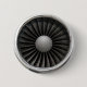 Främre sikt över en modern turbinmotor i jet som visar fläkt-bladen och blanka motorhuvar i silver.