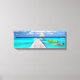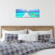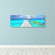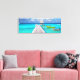 Panorama canvas-landskapet är tryckt på en träbrygga med några färgstarka båtar och en tunn hut i den blåa havslagunen av tropiska Stillahavsöarna Rangiroa, nära Tahiti och Bora Bora i Fransk Polynesia. Underbar sommartid på din dekoration!