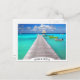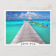 Vykort från en träbrygga med färgade båtar och en tunn hut i den tropiska Stillahavsön Rangiroa, nära Tahiti och Bora Bora i Fransk Polynesien med vitt kant och texten "Rangiroa".
