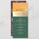 Enkel, kalligrafi, modern, elegant, juveltoner, grönt, gult och plommon lila bröllop-meny med gyllene guld blommigt snöre.