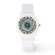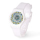 Den här sportbevakningen har en vit ram och band och är vackert försedd med en originell digital målning av Leslie Sigal Javorek, inspirerad av den underbart invecklade smycken- och mendhi-formgivningen (henna tattoos) från Indien. I skuggor av blått, turkos, lila, pärlor och guld.