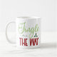 Den här festliga kaffet mugg har textbilden "Jingle All the Way" i grönt och röd typografi med holly löv. Perfekt för julhelgen.
