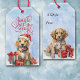 På ena sidan av denna julklapp är märkrn en vattenfärgsbild av en valp hund som bär en Jultomten hatt. Paket står inför honom. Den stiliserade röda texten ovanför bilden säger "Jingle all the Way". Bilden och texten placeras på en himlar blå vattenfärgsbakgrund. Märkrns baksida har en annan bild av en söt valp och anpassningsbarnas text.