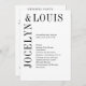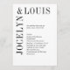 Det moderna bröllopsprogrammet har en minimalistisk svartvit design med namn i ett stort teckensnitt längs den lämnat sidan och överst. Det här är enkelt nog för ett formellt bröllop, men det är ett djärvt påstående.