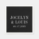 Moderna napkins i bröllop med ett minimalistiskt svart format med namn i stort teckensnitt tillsammans med ditt bröllop-datum. Det här är enkelt nog för ett formellt bröllop, men det är ett djärvt påstående.