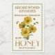 En söt liten 2 x 3-tums honungsetikett med realistiska bin och vilda blommor. HONEY trycks i en metallisk guld-gradient. Streckad gräns i grönt ger en gammaldags beröring.