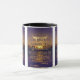Denna tvåtonsmodell i mugg har en typograf som har ett Loubag-utskrifter med lila färgad brev, en gyllene färgad som visar "John 1:17" KJV-bibelteckning över en bild med stor gult måne solnedgång med stjärnor över ett lila tropiskt hav i detta trosbaserade tema. Den här versen hänvisar till kapitlet Bok i John 1st som visar den sjuttonde verandan av detta bibelcitattemat från Kung James-bibeln. Behållaren och fälgen är glaserade i motsvarande färg i 11 eller 15 uns stora mikrovågsugn och säker keramikkonstruktion av diskmaskiner.