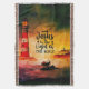 Knavla med kristna inspirationstecken ger en bild av en målning av nattens havsvattenfärg, inklusive en båt och en röd och vit fyr med ljussken i mörken. Bible Verse John 8:12: "Jesus är världens ljus."
