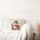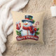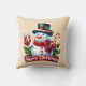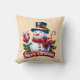 Ce design de Noël présente un bonhomme de neige souriant, vêtu d’un haut-de-forme noir orné d’un flocon de neige et d’une branche de houx. Le bonhomme de neige porte une écharpe rouge à carreaux et tient dans sa main gauche un cadeau rouge avec un ruban blanc, tandis que sa main droite tient une canne en sucre d’orge rouge et blanche. À ses pieds se trouvent des baies rouges et des feuilles vertes, ajoutant une touche colorée au tableau. L’image est surmontée par une bannière rouge ondulée avec l’inscription “Merry Christmas” en lettres blanches stylisées, soulignées par deux branches de sapin. L’ensemble évoque la chaleur et la joie des festivités hivernales, rendant ce design parfait pour transmettre les vœux de saison.