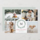 Modern, minimal julfotokort med fyra foton med en modern vattenfärgad krandeaccent, som ramar din familj monogram eller initialt. God jul står i rött, som kan anpassas till vilket hälsning som helst. Kortets baksida har ett andra personligt hälsning tillsammans med namn.