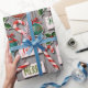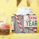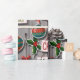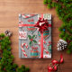 This design features a charming array of holiday elements set against a textured, light gray background that resembles weathered wood.